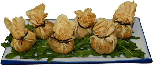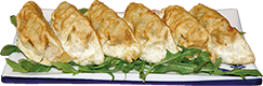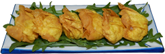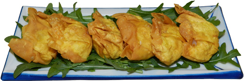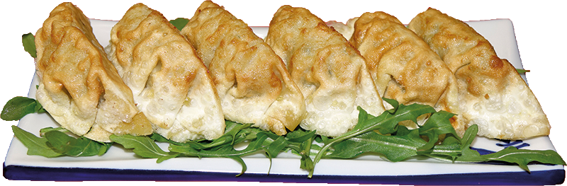 108. Ebi Gyoza 6 frittierte Garnelen-Teigtaschen, Rucola mit Sesamsauce