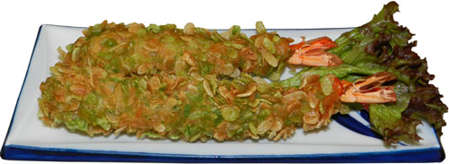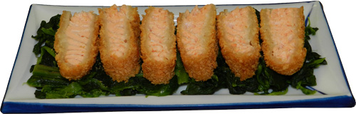 212. Salmon Paste Salat frittierte Lachspaste mit gemischten Salat und Sesamsauce
